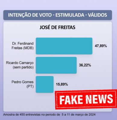 Hoje, dia 21 de março, está circulando em grupos de WhatsApp uma pesquisa eleitoral falsa sobre as eleições na cidade de José de Freitas, no Piauí. É importante esclarecer que nenhuma pesquisa oficial foi divulgada nesta quinta-feira.