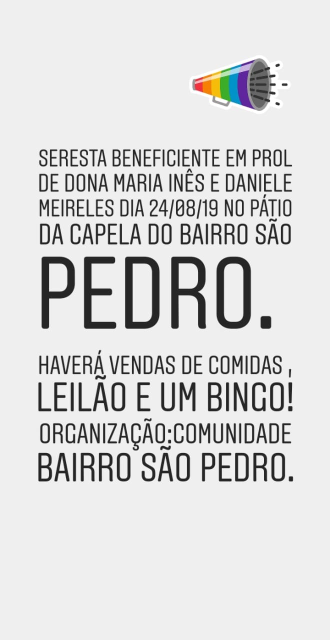 Associação de moradores do Bairro São Pedro e o Presidente Carlos Silva, convidam toda população da Cidade de José de Freitas-PI para participar de uma seresta beneficente em prol de Maria Inês e Daniele Meireles, a mãe e a filha está passando por dificuldades financeiras e precisa de ajuda. Dona Maria Inês trabalhou muito anos em Teresina, e estava recebendo um auxilio do Instituto Nacional do Seguro Social (INSS), mas o beneficio foi cortado. Deste Janeiro de 2019, que Dona Maria Inês e Daniele Meireles passam dificuldades financeiras.