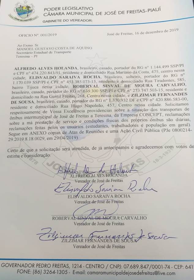 Na manhã desta terça-feira, 17 de dezembro de 2019, aconteceu uma audiência com presidente da Associação dos Estudantes e Trabalhadores de usuários de José de Freitas, Anaelton, Vereadores Alfredo Holanda, Pampa, Zilzimar Fernandes, vice prefeito Antonio Abreu, Prof. João Paulo, Henrique, com Secretário de Transportes do Estado Sr. Manoel Gustavo, solicitando providências urgentes a respeito do péssimo serviço que a empresa CONCEPT vem oferecendo aos usuários do nosso município, principalmente aos estudantes e trabalhadores.