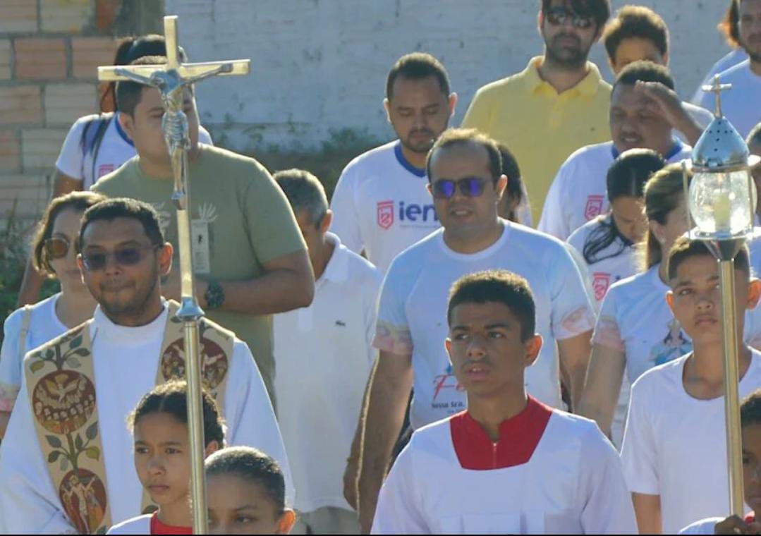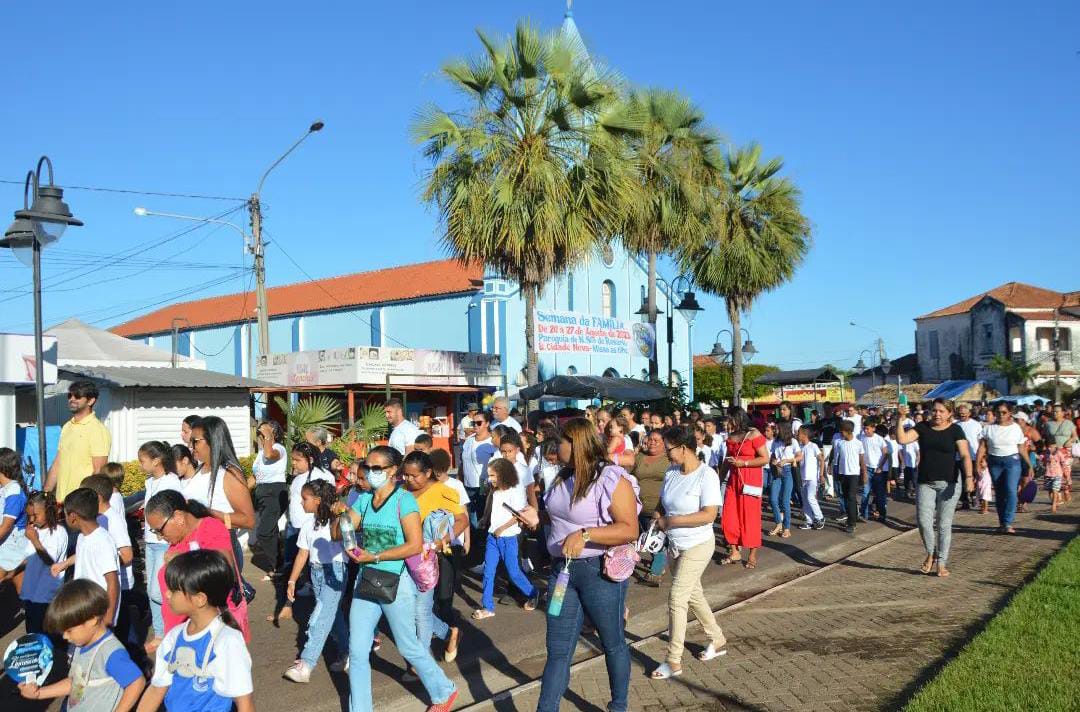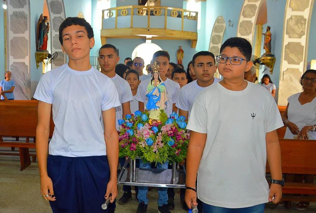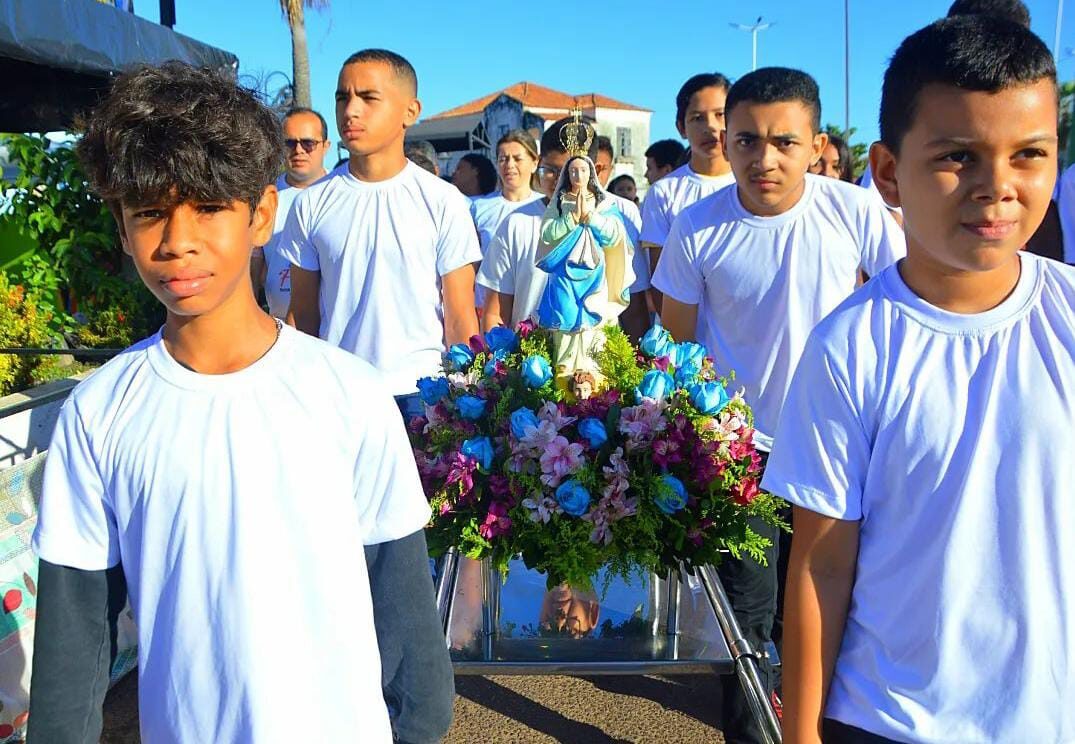 Escolas municipais, estaduais, federais, particulares e filantrópicas participaram desde momento. Os alunos revezaram o andor carregando a imagem de nossa Senhora.