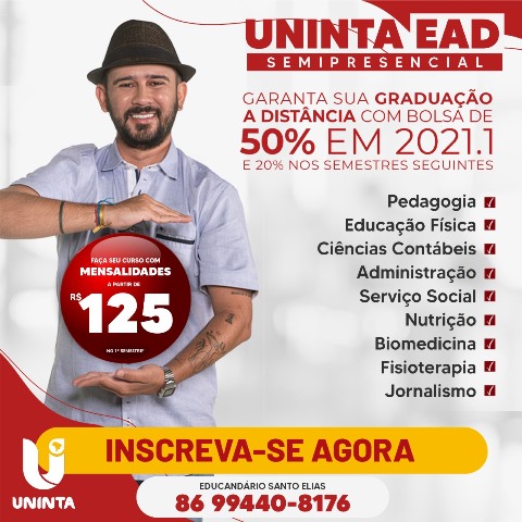 Não perca tempo e venha fazer sua graduação no Uninta. Agende já seu horário por ligações ou Whatsapp (86) 99440-8176 ou vá até o nosso Centro de apoio que funciona de segunda-feira a sexta-feira em horário comercial, no Educandário Santo Elias, centro de José de Freitas-PI. Aulas previstas para iniciar no final de Março de 2021.
