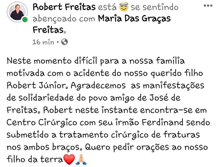 Dr. Robert Freitas usou sua rede social para divulga uma nota sobre o acidente do filho.”Neste momento difícil para a nossa família motivada com o acidente do nosso querido filho Robert Júnior. Agradecemos as manifestações de solidariedade do povo amigo de José de Freitas. Robert neste instante encontra-se em Centro Cirúrgico com seu irmão Ferdinand sendo submetido a tratamento cirúrgico de fraturas nos ambos braços. Quero pedir orações ao nosso filho da terra” Agradeceu.