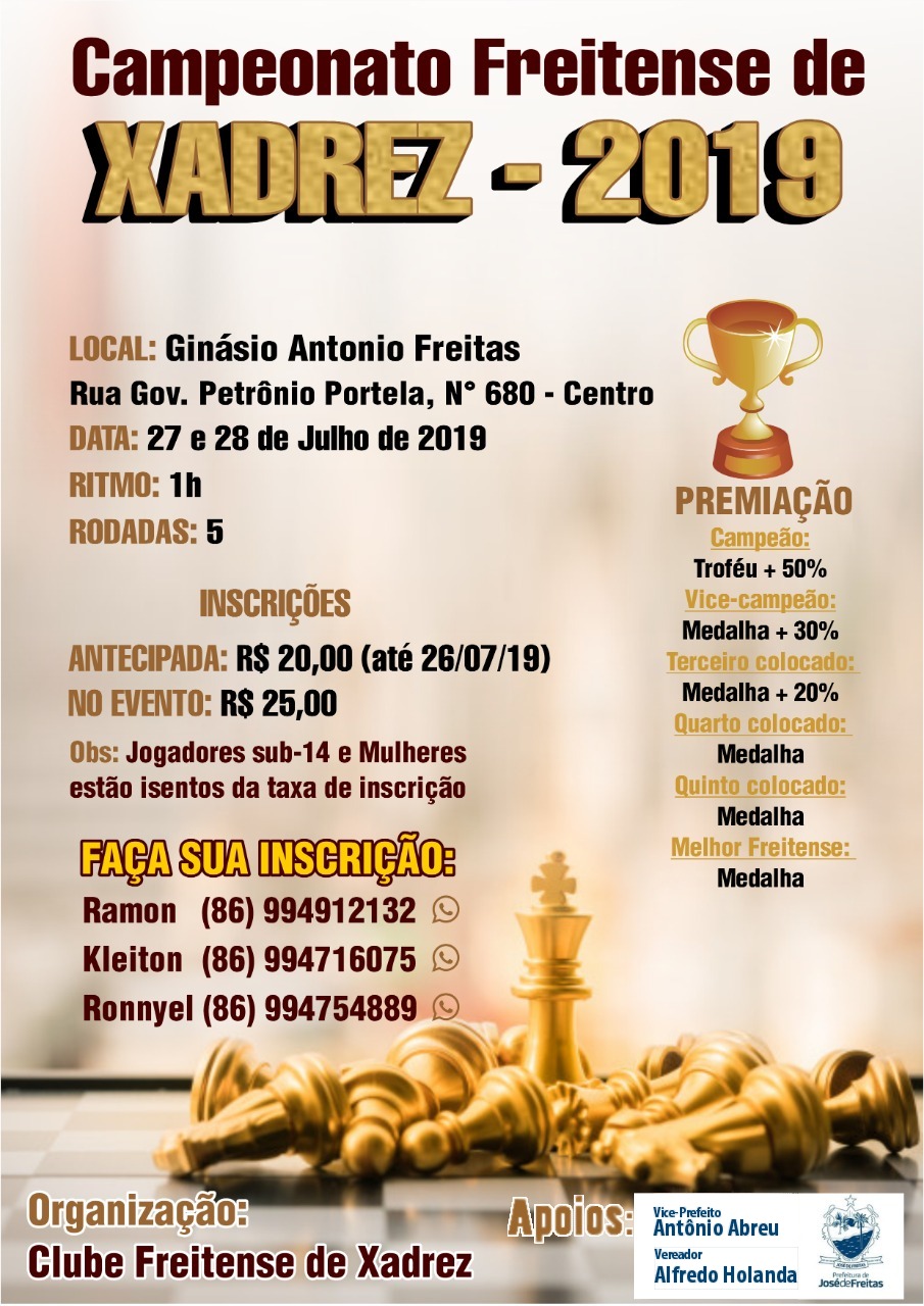 Todos estão convidados a participar do evento que permanecerá com inscrições abertas até o dia 27 de julho de 2019 (pouco antes do início do torneio).O evento está sendo organizado pelos freitenses:Grupo de Xadrez Freitense, Prof. Ronnyel Carlos, Prof. Kleiton Santos, Ramon Domingos e Henrique Ferreira.
