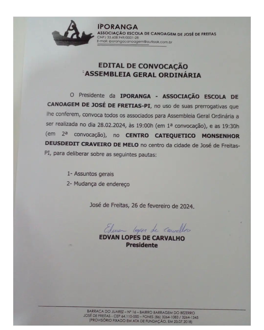 No próximo dia 28 de fevereiro, a Associação Escola de Canoagem de José de Freitas-PI, liderada pelo Presidente Edvan Lopes de Carvalho, têm um encontro marcado para a Assembleia Geral Ordinária. O evento acontecerá no Centro Catequético Monsenhor Deusdit Craveiro de , localizado no centro da cidade de José de Freitas-PI, com a primeira convocação prevista para as 19:00h e a segunda para as 19:30h.