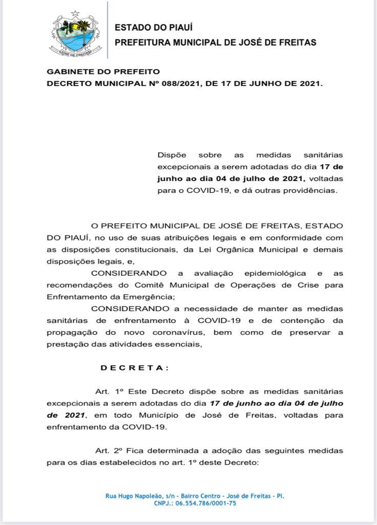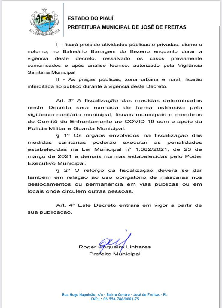 Praças públicas na zona urbana e rural do município também foram interditadas. A Polícia Militar e Guarda Municipal de José de Freitas estão fiscalizando todos locais.