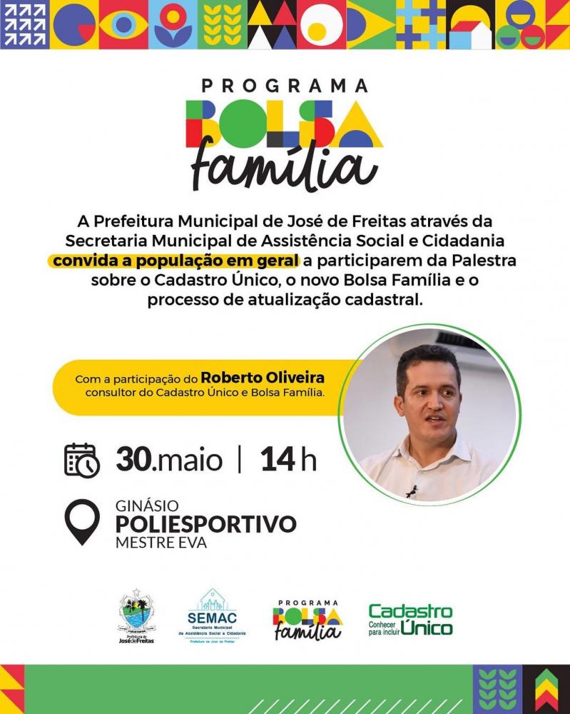 prefeitura de José de Freitas, através da Secretaria Municipal de Assistência Social e Cidadania, convida a população para participar de palestra sobre o Cadastro Único, o novo Bolsa Família e o processo de atualização cadastral.
