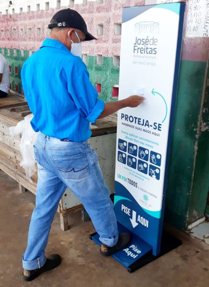 A Prefeitura de José de Freitas iniciou neste sábado (23/05) a instalação de totens fixos, em locais estratégicos da cidade. Os aparelhos são alimentados com álcool em gel 70%, para que a população possa fazer a higienização das mãos ao entrar e sair desses locais, os equipamentos possuem um sistema de dispensação do produto que deve ser acionado na base, com ajuda dos pés, evitando contato pelas mãos.
