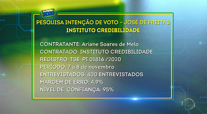 O prefeito Roger Linhares (Progressistas) lidera corrida eleitoral no município de José de Freitas. Segundo pesquisa do Instituto Credibilidade realizada nos dias 7 e 8 de novembro, o gestor, que é candidato à reeleição, aparece com 51,50% das intenções de votos na sondagem estimulada; Robert Freitas (MDB) está em segundo lugar, com 25,50%; Alfredo Holanda (PSD) tem 9,50% das intenções de votos e Frango Rei (Patriota) aparece com 2,75%. Dos entrevistados pelo Instituto Credibilidade, 9,5% não sabem e não opinam sobre o pleito e apenas 1,25% opta por nenhum/nulo/branco.