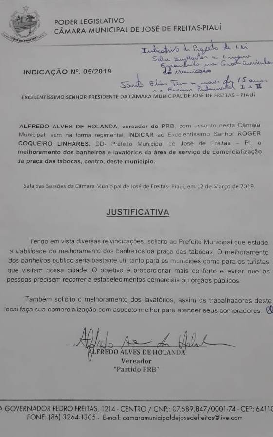 O vereador Alfredo Holanda (PRB) solicitou durante seção ordinária realizada na última terça-feira 12 de março de 2019, um indicativo de número 05/2019 que deve ser encaminhado ao Prefeito Roger Linhares (PP). No indicativo o parlamentar solicitou ao Poder Executivo do município, que realize feita a limpeza e melhoramento dos banheiros e lavatórios da Praça das Tabocas localizada no Centro de José de Freitas-PI.