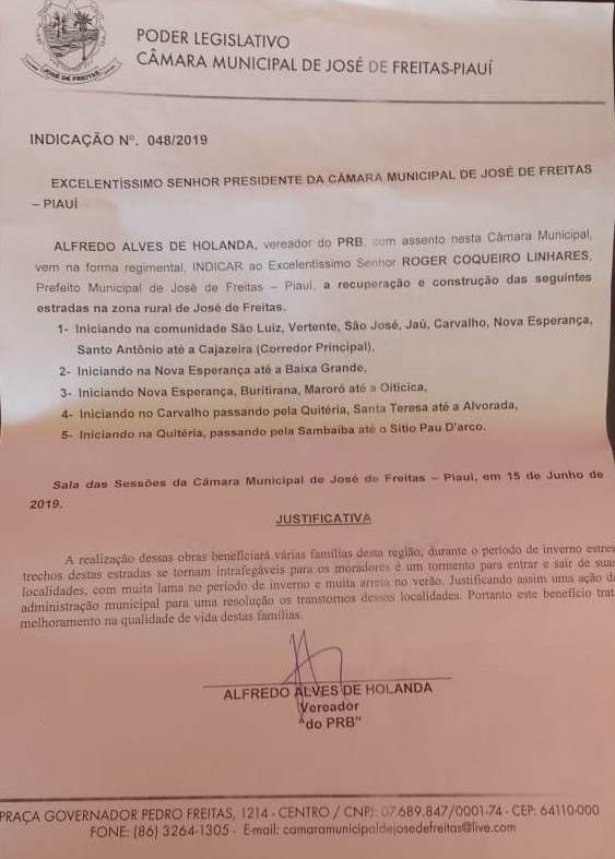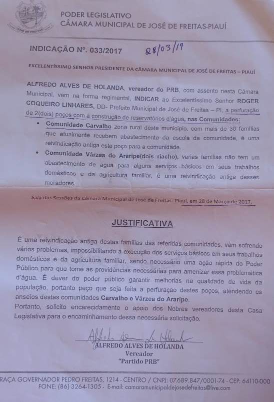 O vereador Alfredo Holanda durante sessão ordinária realizada na Câmara Municipal de vereadores na última terça-feira 01 de outubro de 2019, solicitou à prefeitura de José de Freitas-PI, uma indicação de número 033, que o mesmo fez desde do mês de março/2017 e nunca foi atendido. A mesma indicação trata de solicitação de melhoramento de abastecimento de água na comunidade Carvalho zona rural de José de Freitas-PI.